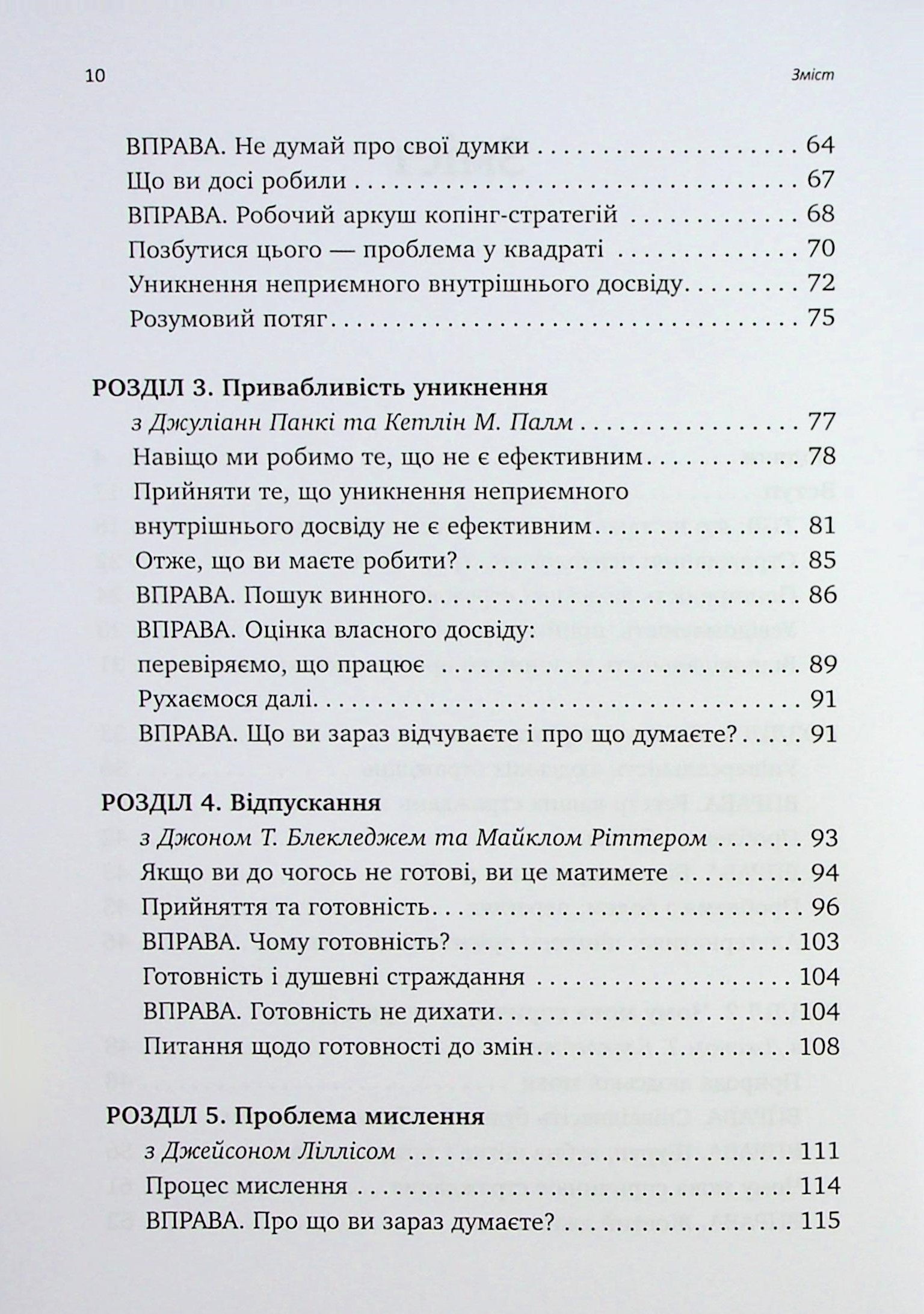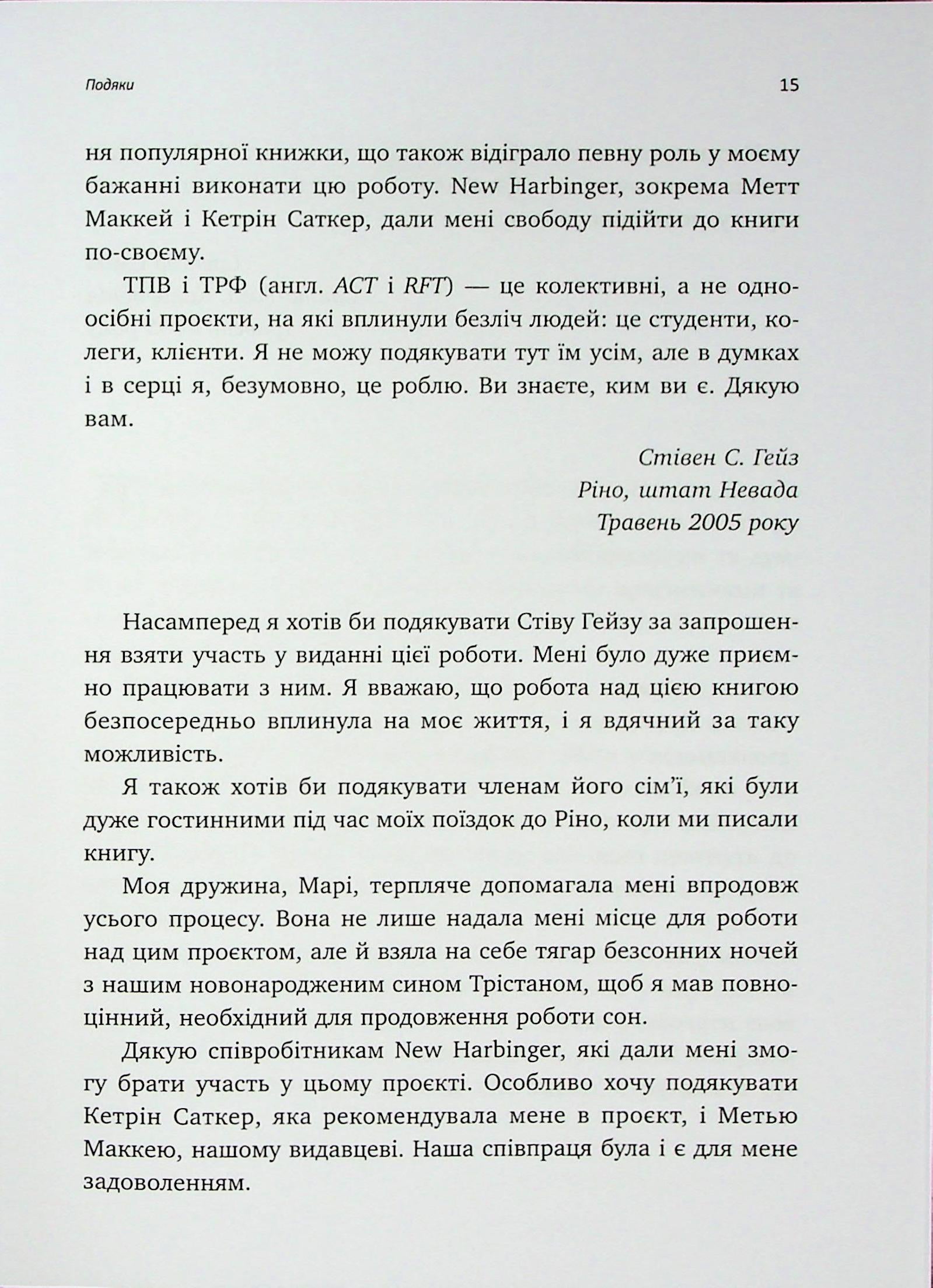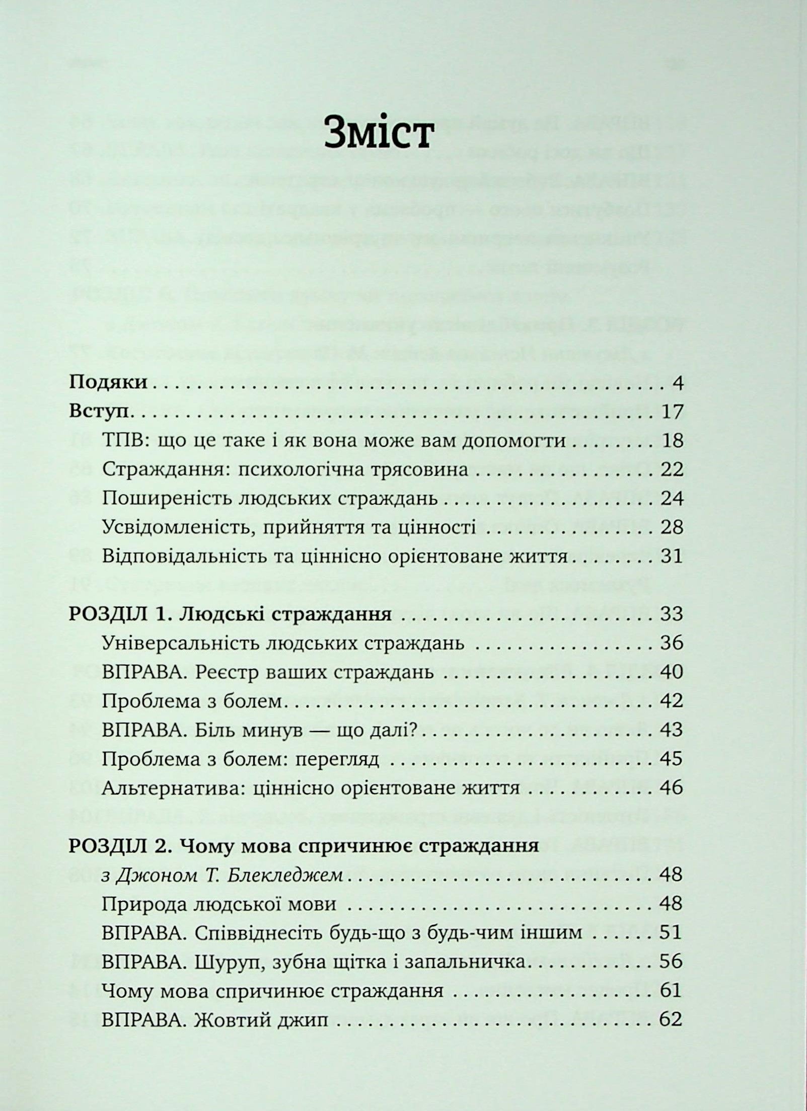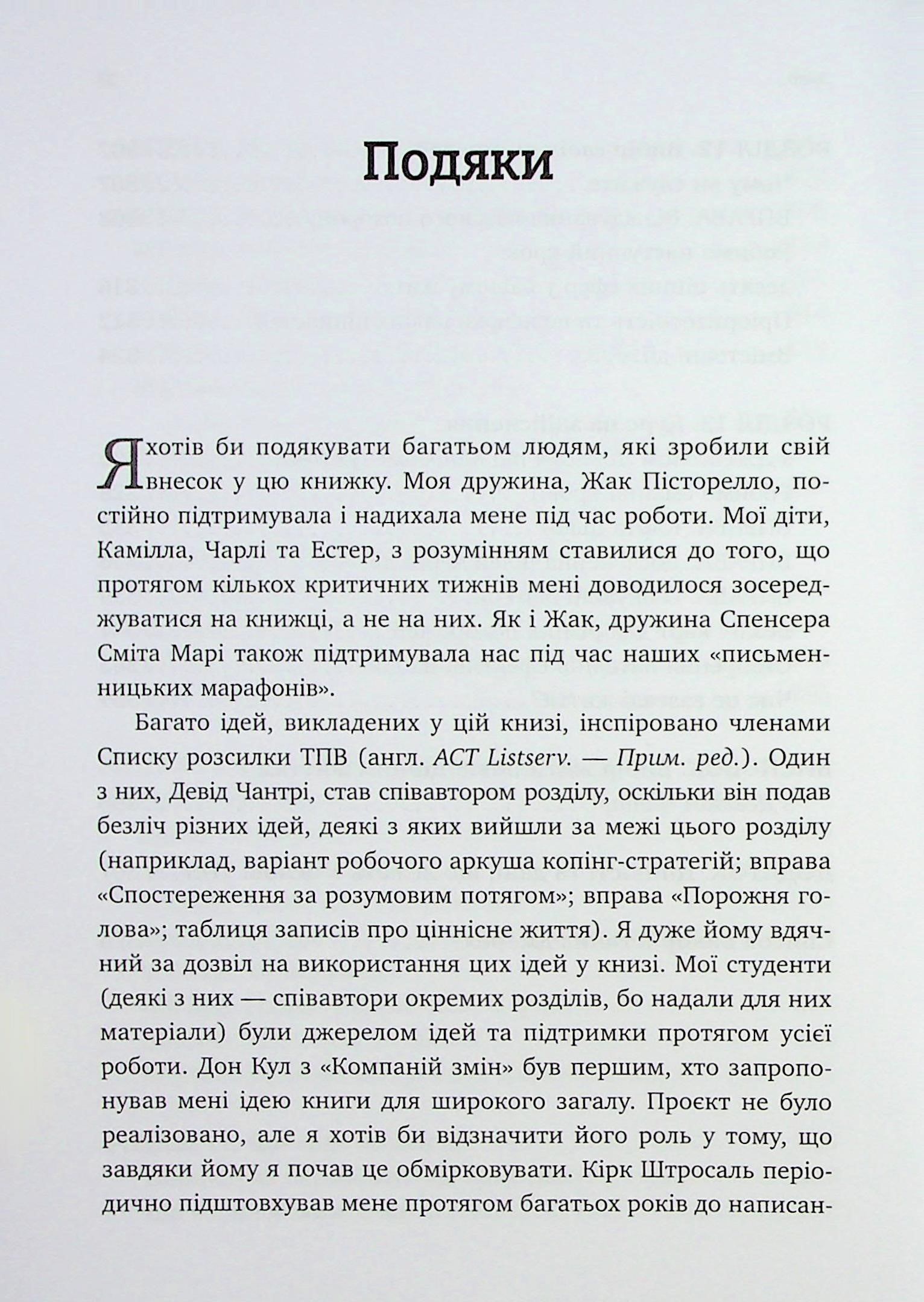 Книга відомого в усьому світі психолога Стівена Гейза та письменника Спенсера Сміта «Вивільни свій розум і почни жити. Нова терапія прийняття та відповідальності» — це, мабуть, найзахопливіший з усіх посібників із самодопомоги, що базується на концепціях терапії прийняття та відповідальності. ТПВ дає новий, на перший погляд парадоксальний, погляд на те, чому ми страждаємо, й навіть на саме психічне здоров’я. Працюючи з книгою, ви досліджуватимете своє мислення та його пастки, детально вивчатимете свої цінності й будете з готовністю та відповідальністю формувати нові моделі поведінки, ви навчатиметеся прийняття та усвідомленості тут і тепер, щоб не відкладати на потім осмислене й повноцінне життя.Книга стане корисною для подолання низки психологічних проблем, зокрема проблем із тривогою, гнівом, депресією. Але не тільки. Автори пропонують читачам здійснити революційний вибір у житті: вивільнити свій розум та почати жити реальним ціннісним життям.