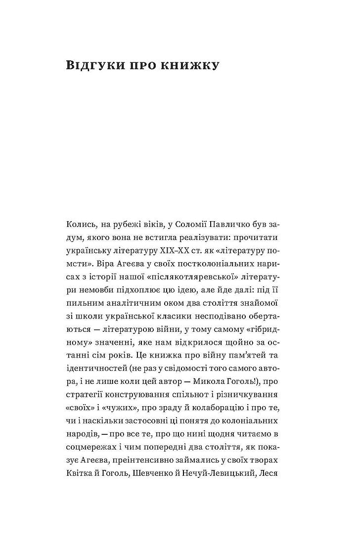 У цій книжці авторитетна літературознавиця Віра Агеєва через призму культурного процесу аналізує український спротив імперії та боротьбу за збереження колективної пам’яті.