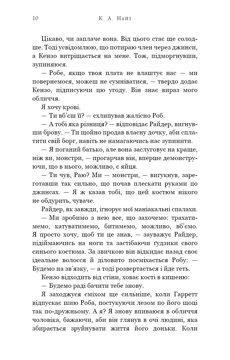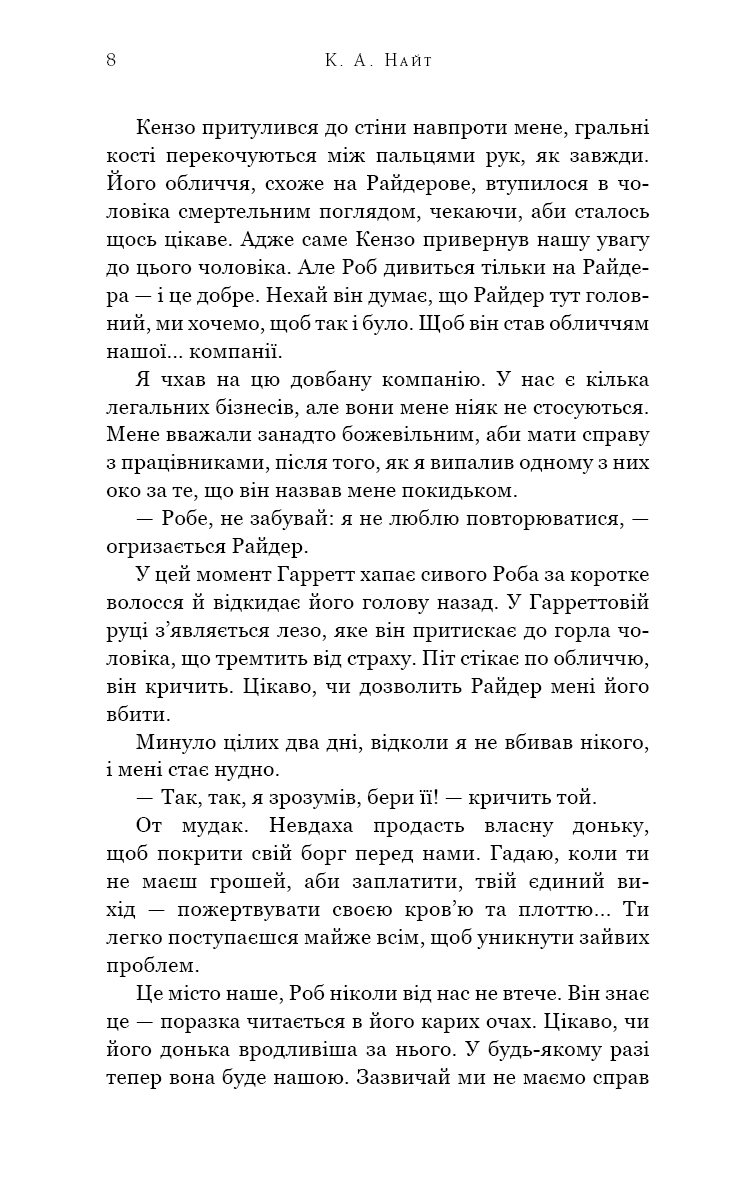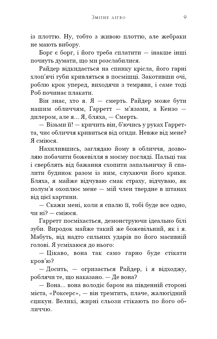 Вони керують цим містом і всіма в ньому. Їхні угоди такі ж мерзенні, як і бізнес, а їхньої репутації достатньо, щоб поставити дорослого чоловіка на коліна, змусивши його благати про пощаду. Вони не ті люди, з якими ти матимеш справи, але мій тато мав. Старий заборгував їм, а потім продав мене, щоб покрити свої збитки. Так, продав мене. Тепер вони володіють мною. Я їхня у всіх сенсах цього слова. Але я ніколи не була лагідною й поступливою. Ці чоловіки дивляться на мене з тугою. Їхні пошрамовані, закривавлені руки міцно тримають мене. Вони хочуть усю мене, усе, що я можу їм дати, і не зупиняться, доки не отримають саме це. Вони можуть володіти моїм тілом, але їм ніколи не здобути мого серця. Гадюки? Я збираюся змусити їх пошкодувати про той день, коли вони мене забрали. Ця дівчина? Вона теж кусається.